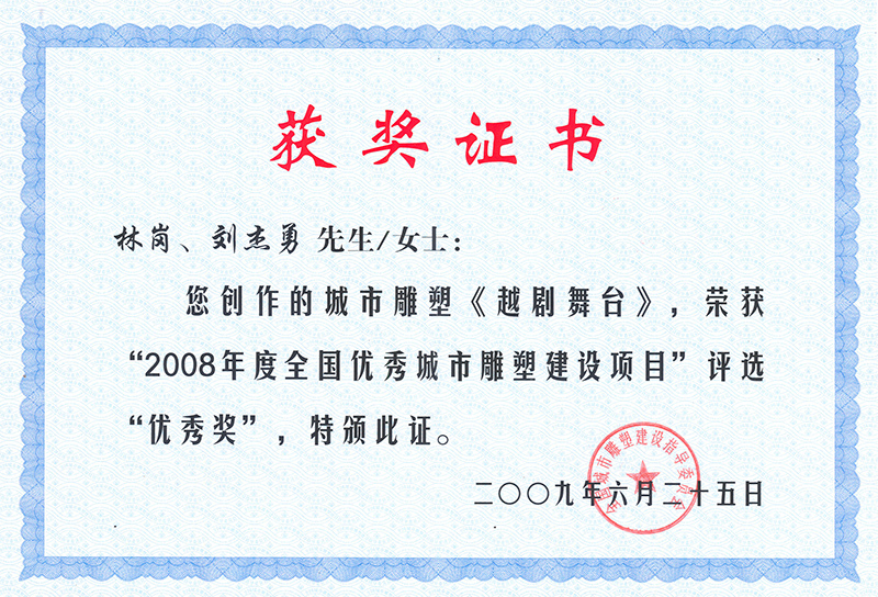 《越劇舞臺(tái)》獲“2008年度全國城市雕塑建設(shè)項(xiàng)目”優(yōu)秀作品獎(jiǎng)
