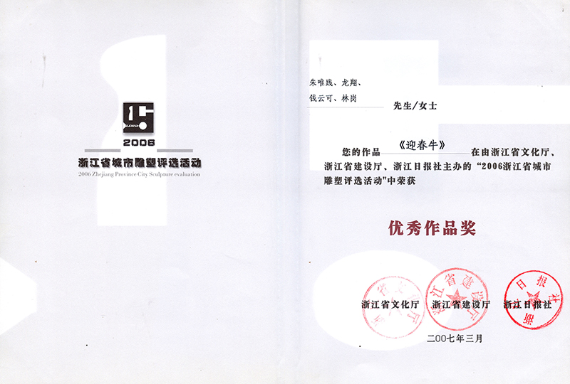 《迎春牛》“2006年浙江省城市雕塑評(píng)選活動(dòng)”優(yōu)秀作品獎(jiǎng)