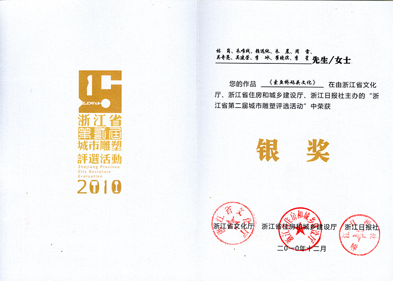 《賣魚橋碼頭文化》“2010年第二屆浙江省城市雕塑評(píng)選活動(dòng)”銀獎(jiǎng)
