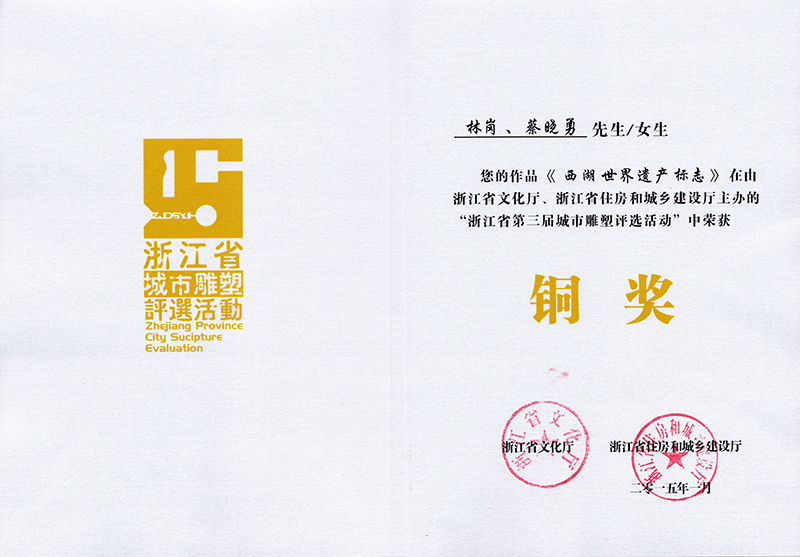《西湖世界遺產(chǎn)標(biāo)志》“2015年第三屆浙江省城市雕塑評選活動”銅獎